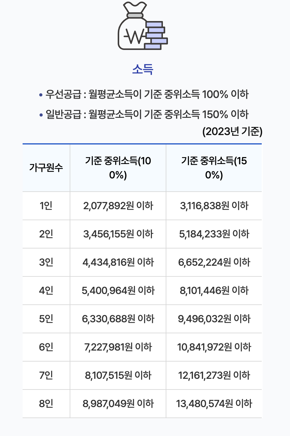 신청 자격: 무주택 자면서 기준 중위소득 150% 이하이고, 총 자산소득 5 분위 중 3 분위에 해당하는 순자산 평균가 이하인 개인 또는 가구입니다.